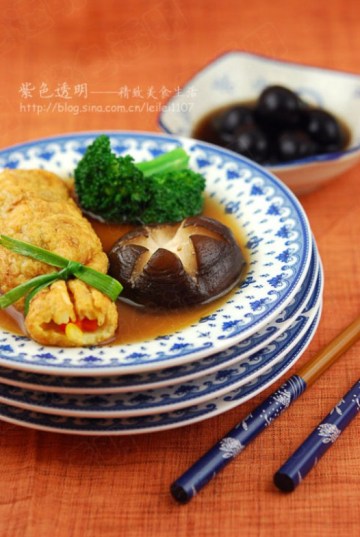 摆盘的时候也可以在豆腐袋子周围装点一些蔬菜,如西兰花,香菇之类的。 日本豆腐水水嫩嫩的,而且软软滑滑的很难控制,在放进油锅前一定要小心别烫到,这个还是猪仔帮我放进去的。 豆腐挤出来的时候一定要小心,口可以剪的大一点,不然豆腐很容易挤碎,我有一块豆腐就挤碎了一点,所以就变成了一个大袋和一个小袋。 这个菜做起来步骤复杂,适合节日餐桌,一年做一次新鲜一下就好了,平时还是简单的小炒做起来更轻松。