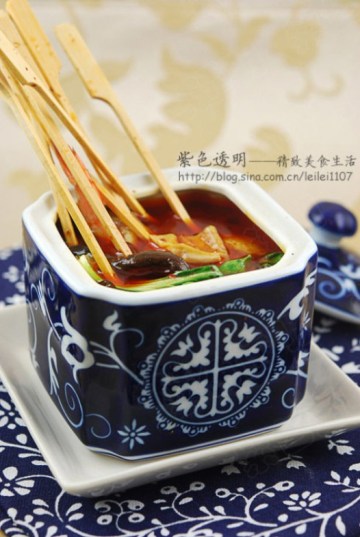 6.我选的是短签子,没有那么大的容器装,所以选了比较小的签来穿。鱼丸类的食材可以多煮一会入味,蔬菜类的后煮,烫一下就行。也可以不煮,直接放在装了汤汁的容器内,用余温烫下即可