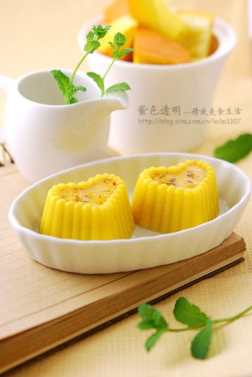 6.把调制好的南瓜糊灌入硅胶模具中,冰箱冷藏1小时左右即可顺利脱模(硅胶模具好脱模,不需要任何防粘处理)取出后淋上糖桂花即可食用