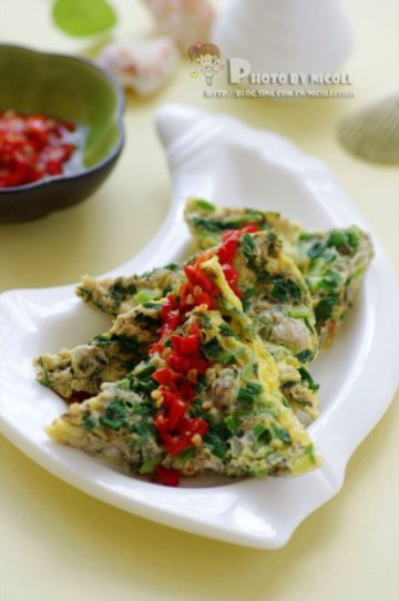 3.热平底锅下油待油热后把海蛎倒进去与青葱末翻炒,等海蛎差不多熟了的时候下粉水(a),锅面凝固.打鸡蛋下去..然後下青菜…再下点粉水..快熟了.翻面 ..后成圆盘状像饼就起锅装盘.然后在上面倒些爱之味甜辣酱或泰式酸甜酱.