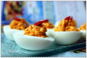 2.把蛋黄取出碾碎,混入千岛酱(或色拉酱)一起搅拌均匀