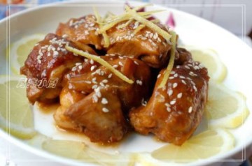 5.鸡肉出锅装盘.锅中剩鱼的汁用淀粉勾芡,淋于鸡肉上.盛器边摆上柠檬片,在 鸡肉上撒白芝麻和柠檬丝装饰,ok.