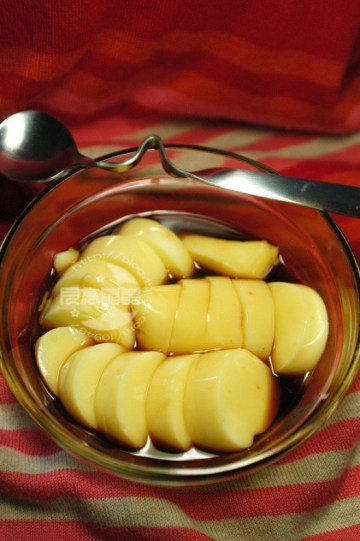 3.把煮好的糖汁倒进装豆腐的碗,用勺子轻轻搅拌,把豆腐弄碎,可以开动了.