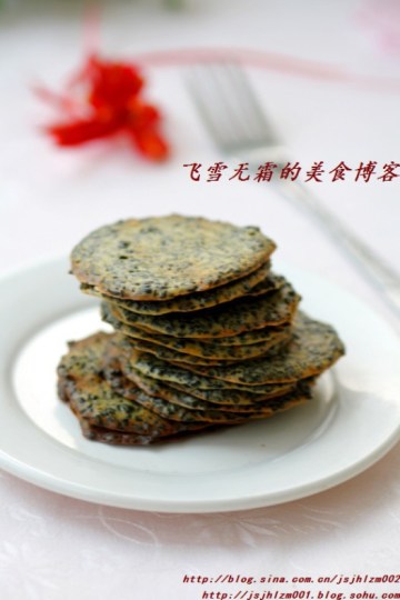 一定要烤透,一点白的都没了,否则就会回软,记得我烤箱刚拿来时烤的就是这个,当时就是没烤透.另外摊薄也很重要,我这次用的是烘培纸不好,还是用锡纸好些,因为烘培纸在这里会有点皱翘. 这是最简单饼干,这种脆饼干不用打发,即使不用擀面杖造型也一样好吃,就是芝麻薄脆啦。