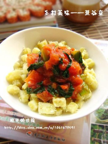 3.家里只有西红柿和小油菜,就炒了个酱做浇头,加了点生抽和竹盐调味。把酱浇在谷垒上,再加点醋就可以开吃啦~