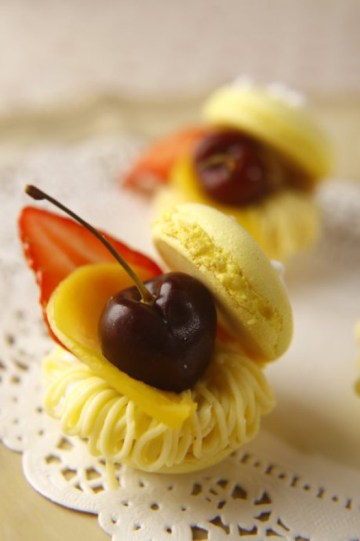 9.将烤好的马卡龙两片为一组,中间挤上馅料,装饰上水果即可