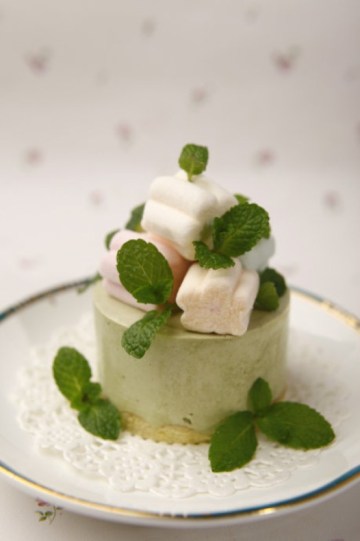 9.在慕斯表面装饰上棉花糖,点缀上新鲜的薄荷叶即可