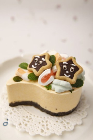 10.在慕斯表面装饰上棉花糖和可爱的饼干,点缀上薄荷叶即可