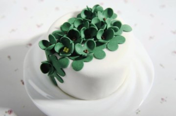 6.用豆形棒将所有的三瓣花依次粘接在蛋糕面上,无需规律,其中一个四瓣花粘接在整体蛋糕的正面