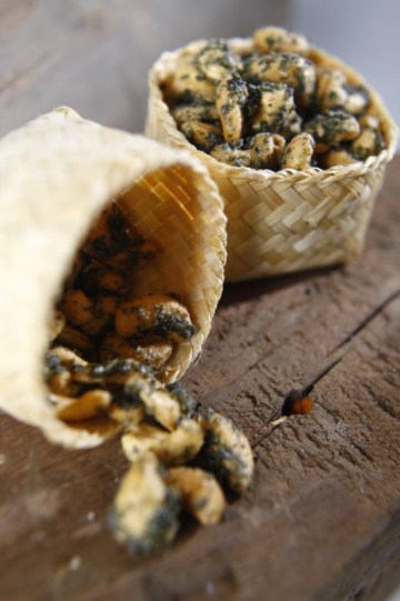 主料:腰果200克,绿茶粉3克,菜叶丝25克。糖30克,味椒盐2克,水50克,精油400克(实耗8克)。