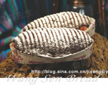 5.将面团擀开挤出气泡,放入苦甜巧克力碎。卷起,放入模具内