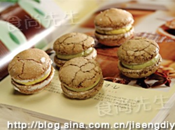 低筋面粉10g,杏仁粉60g,绿茶粉5g,绵糖30g,蛋清100g,糖粉60g,盐1g,
