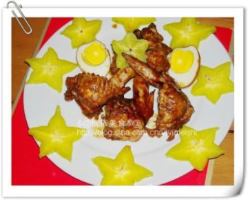 鸡翅3只,糯米饭半碗,腊肠1小段,香菇3个,虾米1把,葱1根,鸡蛋2个,生抽2汤匙,老抽1汤匙,白糖1小勺,五香粉1小勺,杨桃1个