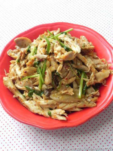 4.鸡做好后,放冷用手将鸡肉撕成小块,再将冷却的鸡油倒入搅拌装盘即可