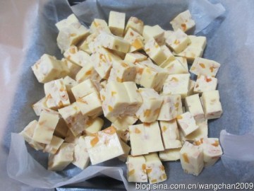 用牛油纸将整个糖团包好,压成约2cm厚的扁方块,用刀切成方块或长条状即可。