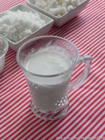 牛奶60亳升,2滴椰子香精,一些熟椰子末,一匙奶油