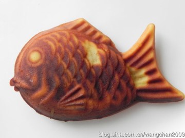 3.模子抹黄油,倒入小量面糊,挤入红豆沙