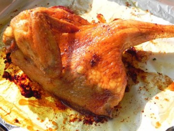 五、翻转鸡只,烤皮的表面,同样温度和时间,更加要时时注意了,如果表面不够脆或不够成色,可再烤,但成色肯定不如加了烧烤酱和蜜糖的深,你去超市,看见买的熟鸡就知道了;