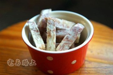 1.香芋一斤,白砂糖一杯。把香芋切成中指厚的长条状先蒸十五分钟。