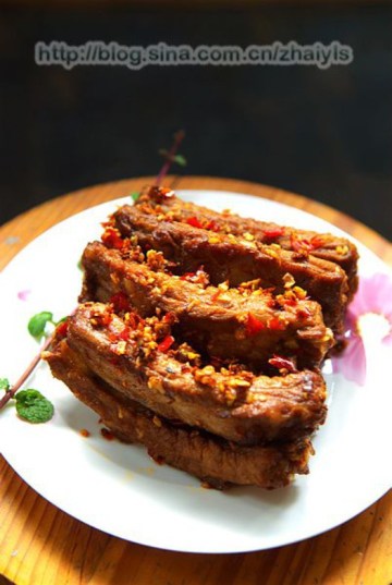 3、排骨炸成金黄色时捞出装盘,同时可以在排骨上撒椒盐或辣椒粉调味。