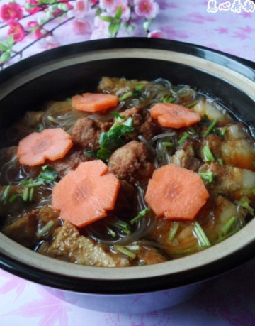 主料:猪五花肉约200g、干粉条约150g.豆腐约250g胡萝卜2根, 白菜4-5片
