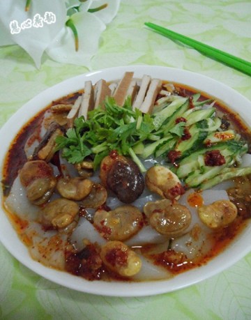 豌豆粉100克(或木薯生粉),清水600克,香干,浑源酥大豆,黄瓜,香菜,香葱,蒜头,山西老陈醋,芝麻香油,自制辣椒将