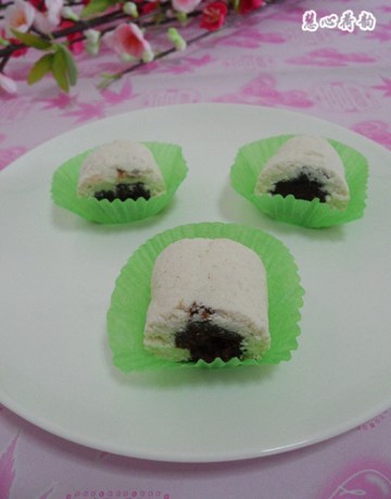 6、将面团包入豆沙馅。