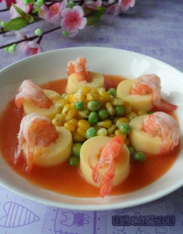 玉子豆腐1袋,虾6只,玉米1个,豌豆50克,食盐,白糖,水淀粉,番茄沙司,甜辣酱