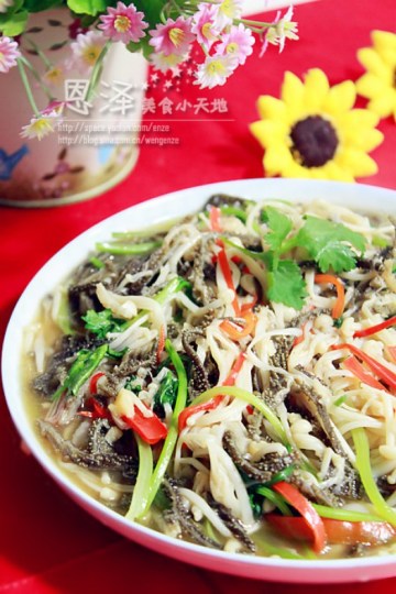 1.牛百叶清洗干净,切的时候先卷起来切成丝。入沸水快速烫捞出沥干水份