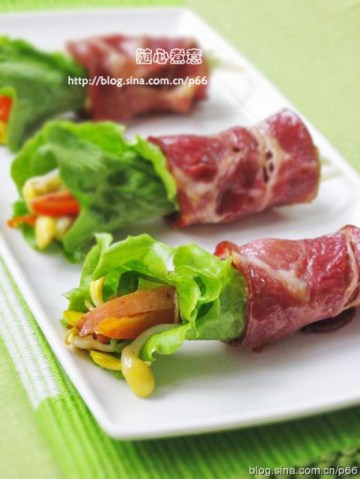5.再用一片培根将生菜围一圈后码放盘中即可
