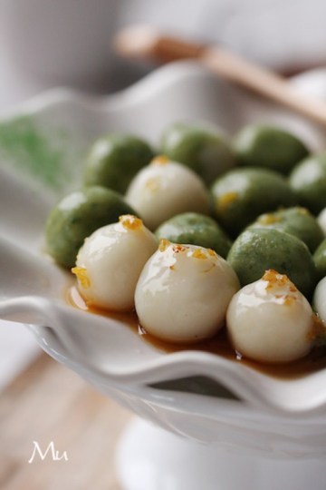 1.糯米粉分别活成两个面团,一个用菠菜汁,另一个用清水合成白色