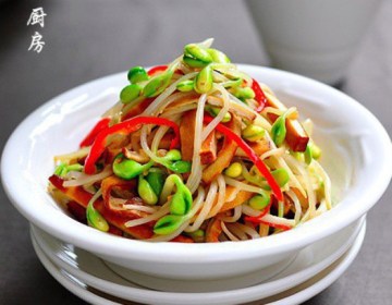 黄豆芽140克,香干5块,红椒1个,大蒜3瓣,生抽1又1/3大匙,砂糖1茶匙