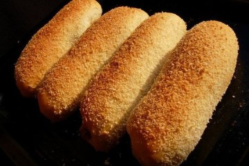 【鸡尾包整形方法】:30克面团擀成牛舌状,长度约8cm,翻面后横向压底边,入8克/个的馅,翻滚紧,收边后9个排紧,上烤盘。