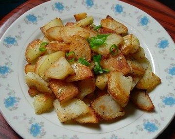 2、平底锅放一点点油(切记:油不可太多),放土豆片,煎至两面发黄时,将土豆片拨至边缘;下葱花、姜片放中间煸出香味,略撒点盐、黑胡椒粉颠勺即可。