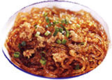 2、炒锅烧热,加油5汤匙,下肉末大火煸炒;炒干水分后,加入豆瓣酱、姜末、蒜茸略为煸炒,烹入绍酒,加入鲜汤、盐、糖、味精、酱油,放入粉丝,汤烧开后略烧片刻,撒上葱花出锅。