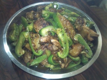 4、锅烧热后放一点油,先把元椒炒一下铲起放盘子,然后将大碗内的鸡全部到进锅内翻炒,待鸡变色的时候加花雕酒进去(大概2两)喜欢酒味的可以放多一点,盖上锅盖后中火,待鸡熟了就把元椒倒进拌均盛起 ,开食啦-----