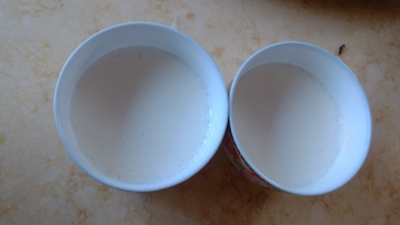 4.把牛奶从离碗高点的地方倒入盛着姜汁的碗中