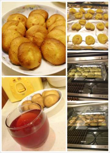 5、预热一下烤箱,然后把挤满曲奇的烤盘放进烤箱,190度15分钟左右就可以了。最后3分钟注意一下曲奇表面有没过火焦了,适时关炉!香喷喷的自家diy牛油曲奇就完成了~下午茶搭配一下咖啡、奶茶、果汁,多美味啊!