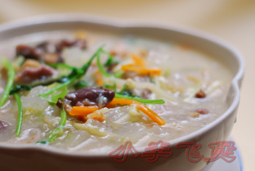 8、煮至九成熟时放入瘦肉、鹅肠、鹅肝,待材料全部熟后再放入浮皮、红萝卜丝、韭黄拌匀。