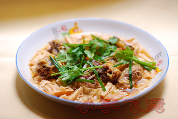 3、支竹飞水,放入腌好的鸡里拌匀,放姜丝、葱段、生油。