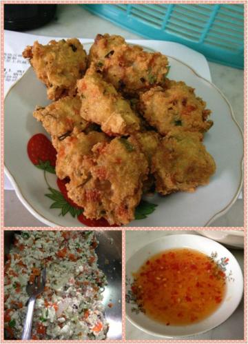 本地豆腐两块压碎,各一些的香菇碎,萝卜碎,青葱碎及肉碎。调味料有鱼露,鸡精粉,麻油,三大匙粟粉。