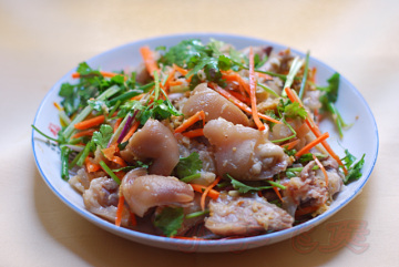 6、另起镬放油,放沙姜粒爆香后淋上猪手上便成。