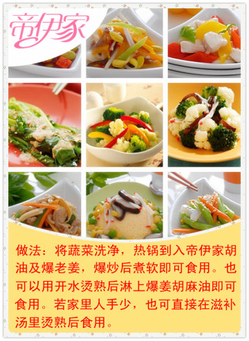 将蔬菜洗净,热锅到入帝伊家胡麻油及爆老姜,爆炒后煮软即可食用。也可以用开水烫熟后淋上爆姜胡麻油即可食用。若家里人手少,也可直接在滋补汤里烫熟后食用。