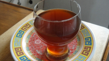 3、将制好的焦糖色、盐水、醪糟汁、白酒混合均匀装入容器盖上盖放一夜让它沉淀,第二天将清澈的黄酒倒出装入消毒后的瓶里即可。