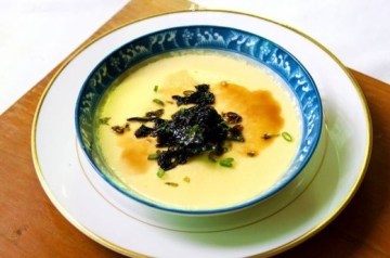 7、取出,加入海苔,倒入少许蒸鱼豉油(可不加),撒入少许葱花(可不加)即可。