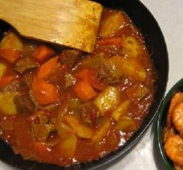 炖好的牛肉200克,土豆250克,胡萝卜150克,芹菜150克,洋葱头100克,蕃茄酱100克,味精、盐适量