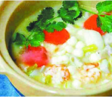 1、将芡实用热水泡开;百合剥成片状,放在冷水里浸一浸;芋头去皮、洗净、切成块;红萝卜去皮、洗净、切片;芹菜洗净、切段;活虾剥皮、去头。