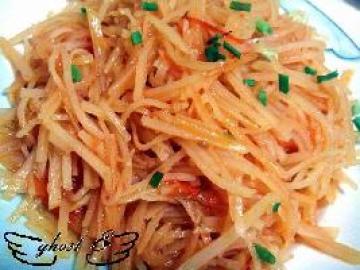 2.锅热稍多油,同时下番茄和土豆丝,炒至番茄化成糊状。