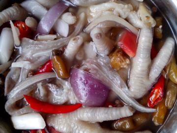 凤爪用开水过一下去腥味,然后另放水煮到鸡爪熟透,捞起后剔去大骨,倒入整瓶超市里买的泡山椒的液体和半瓶山椒,再加入自家泡菜灌里的泡菜水(如果没有泡菜灌就加纯净水再依个人口味加入适量盐,咸味稍重一点才能入味),盐水以淹过凤爪为宜,然后放冰箱第二天吃刚好合适。它的特点主要是突出泡菜的酸盐味。
