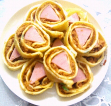 2、煎好的蛋皮捞出平放在砧板上铺满肉松,放上一条火腿,然后把蛋皮卷起来切段就可以吃了。